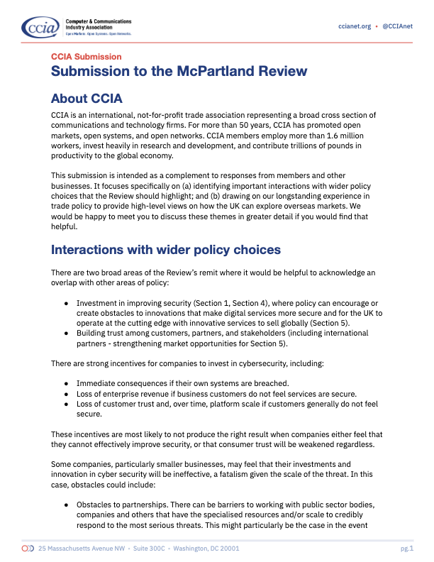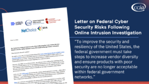CCIA supports efforts to facilitate and streamline information sharing on cyber threats between the private sector and the federal government. Cyber crime laws should be updated to address today’s threats, but must not inadvertently criminalize trivial user behavior. Furthermore, increased research and development, education, and workforce training will produce new tools to address cyber threats and skilled professionals trained to use them. Finally, policymakers should encourage the deployment of strong, ubiquitous encryption, which is increasingly vital for national security, a vibrant and competitive digital economy, and the physical and online safety of individuals.