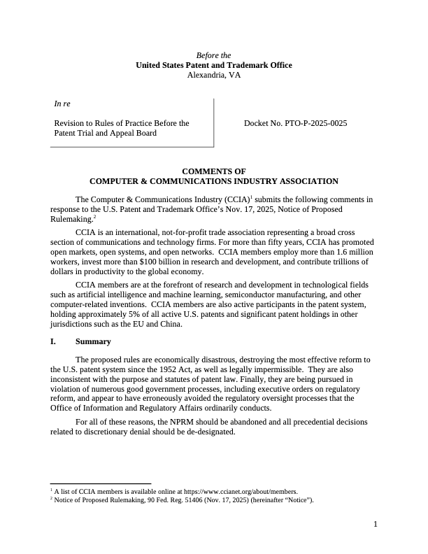 CCIA opposes some proposed reforms which would roll back the reforms that have had a positive impact on the patent system, such as measures to expand patentable subject matter and limit the inter partes review process.
