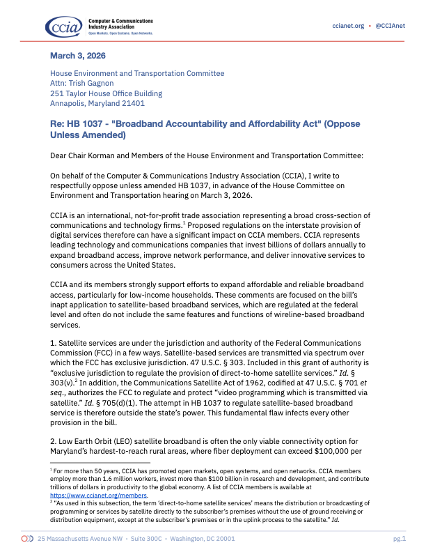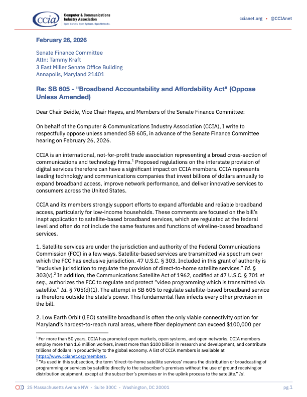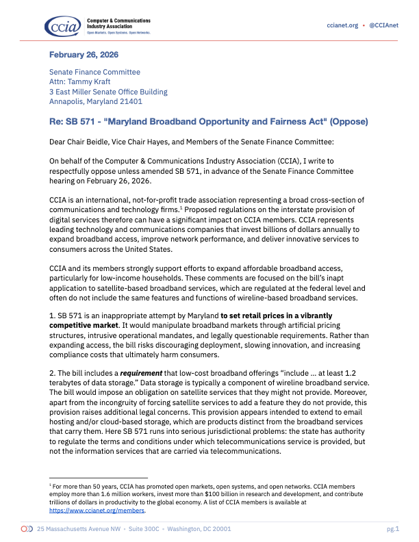 CCIA has a long history in the field of telecommunications and is committed to vigorous competition in every market and submarket of our industry. Connectivity is crucial for our economy, and faster, more reliable networks will assure that telecommunications networks continue to be catalysts for innovation, economic growth, and jobs. The United States needs to ensure that our regulations promote the deployment of next generation networks. Congress and federal agencies must work diligently to enact policies that will reinvigorate broadband access competition, increase broadband connectivity for all Americans, stimulate domestic economic growth, and preserve U.S. competitiveness in a global digital economy.
