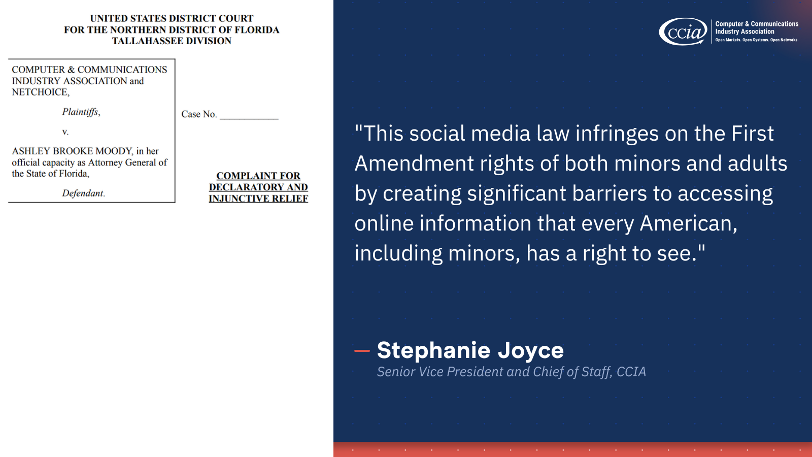 “This social media law infringes on the First Amendment rights of both minors and adults by creating significant barriers to accessing online information that every American, including minors, has a right to see. Protecting children online is an important goal that CCIA shares with legislators, and the far better way to ensure their protection is to give parents the information and tools they need to shield their children from unsuitable content, as digital services providers already have done for decades.”