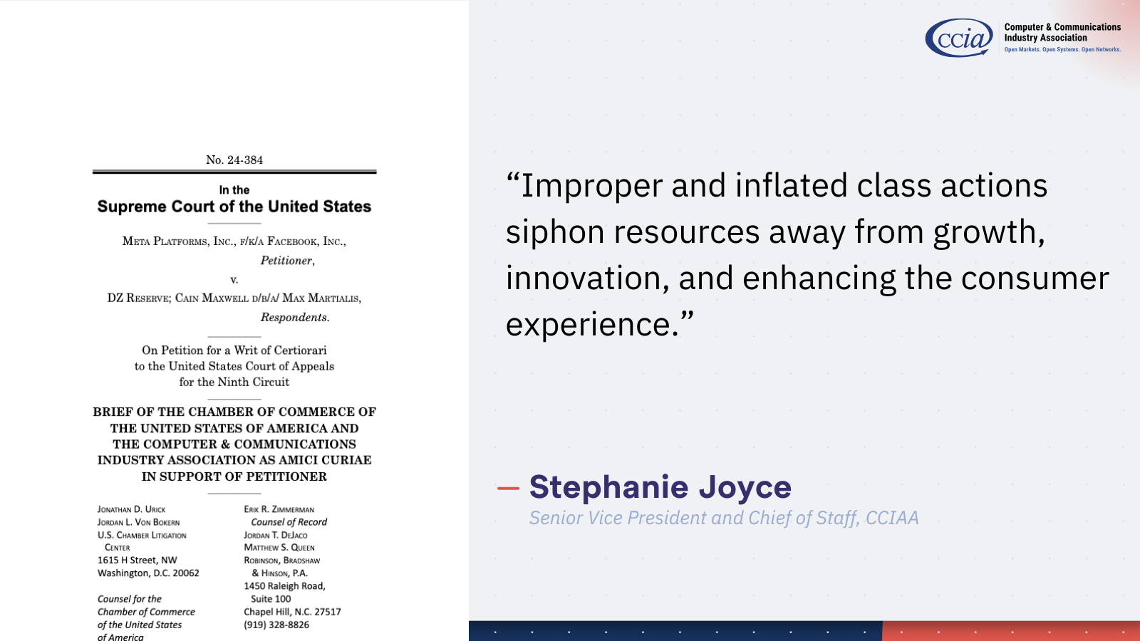 Washington – The Computer & Communications Industry Association and the US Chamber of Commerce filed a brief amicus curiae at the Supreme Court today supporting Meta’s petition for certiorari review of a Ninth Circuit decision to certify a class of plaintiffs that placed ads via the Meta Ad Manager. The brief explains why the Ninth Circuit’s flawed decision runs afoul of federal law and creates a litigious environment that “will harm American businesses and the national economy.”
