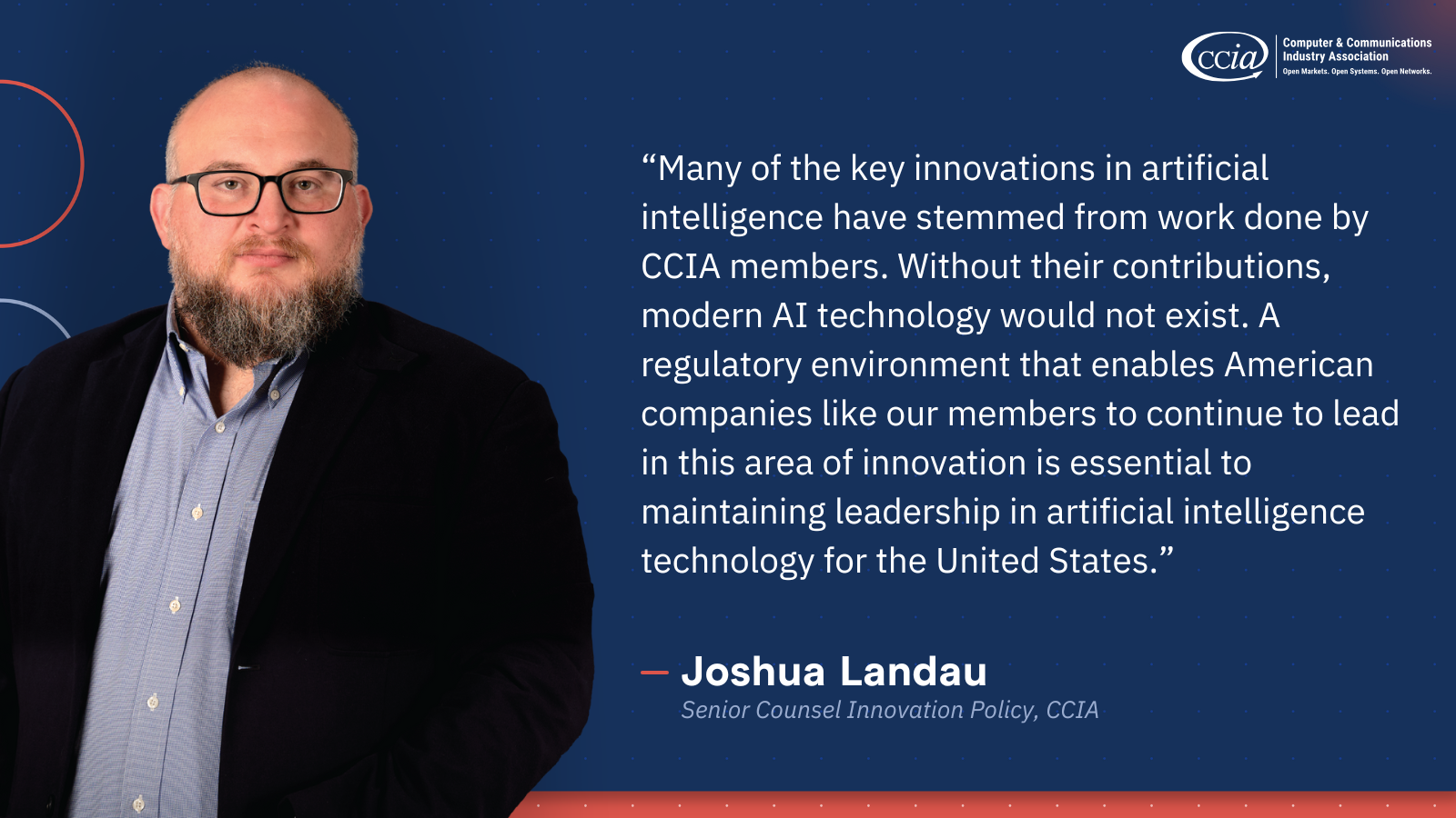 “Many of the key innovations in artificial intelligence have stemmed from work done by CCIA members. Without their contributions, modern AI technology would not exist. A regulatory environment that enables American companies like our members to continue to lead in this area of innovation is essential to maintaining leadership in artificial intelligence technology for the United States.”