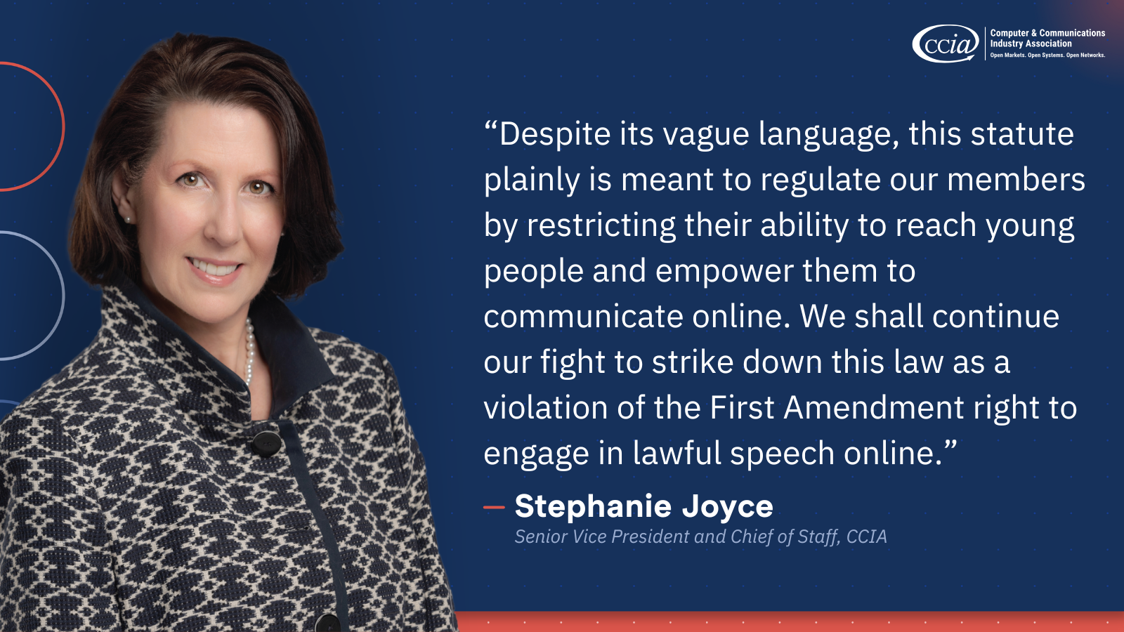 CCIA, with its co-Plaintiff NetChoice, filed the lawsuit in October 2024, explaining this statute violates the First Amendment by blocking and restricting minors—and likely adults as well—from using certain websites to view lawful content.