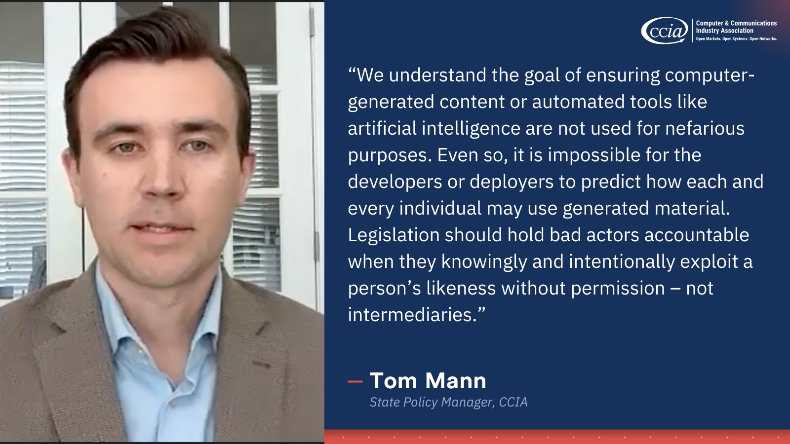 “We understand the goal of ensuring computer-generated content or automated tools like artificial intelligence are not used for nefarious purposes. Even so, it is impossible for the developers or deployers to predict how each and every individual may use generated material. Legislation should hold bad actors accountable when they knowingly and intentionally exploit a person’s likeness without permission – not intermediaries.”