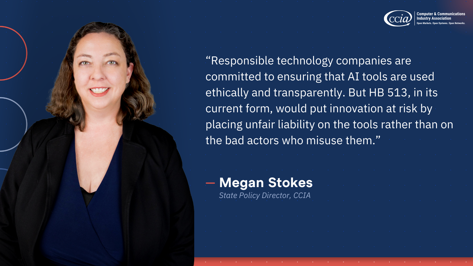 “Responsible technology companies are committed to ensuring that AI tools are used ethically and transparently. But HB 513, in its current form, would put innovation at risk by placing unfair liability on the tools rather than on the bad actors who misuse them. The bill’s vague terms and broad scope could chill free expression and lead to over-censorship by online platforms. We urge Montana lawmakers to adopt the proposed amendments to better target intentional misuse while preserving the ability of businesses and individuals to engage in protected, creative, and lawful expression.”