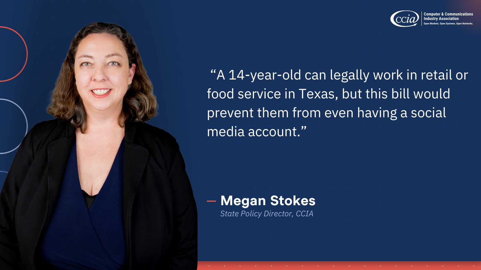 “HB 186 conflicts with Texas contract law and undermines teens’ rights to access information, express themselves, and participate in today’s digital economy. A 14-year-old can legally work in retail or food service in Texas, but this bill would prevent them from even having a social media account. HB 186 is a flawed proposal, one that censors speech rather than supporting families with tools and education.”