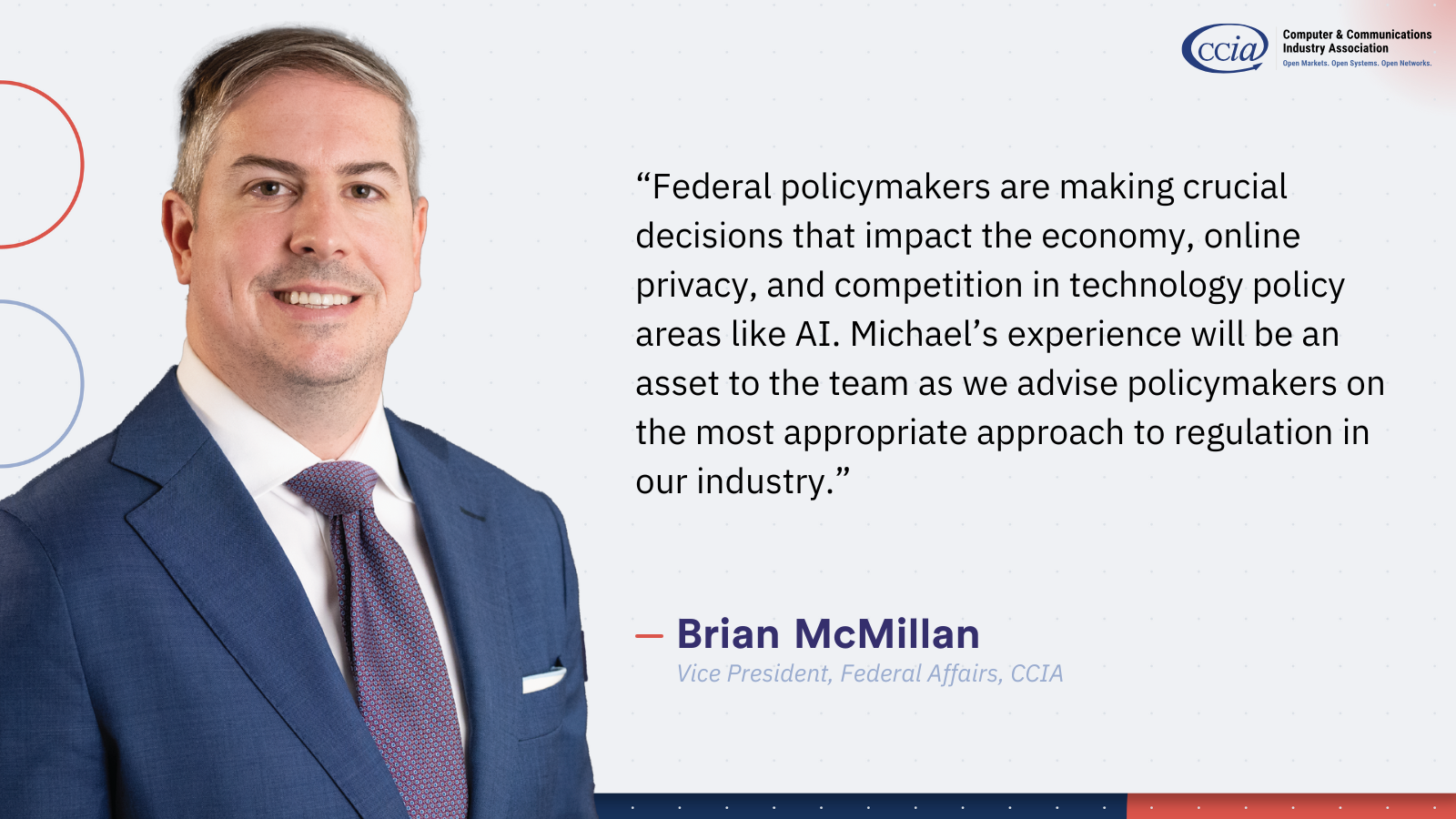 “Federal policymakers are making crucial decisions that impact the economy, online privacy, and competition in technology policy areas like AI. Michael’s experience will be an asset to the team as we advise policymakers on the most appropriate approach to regulation in our industry.”