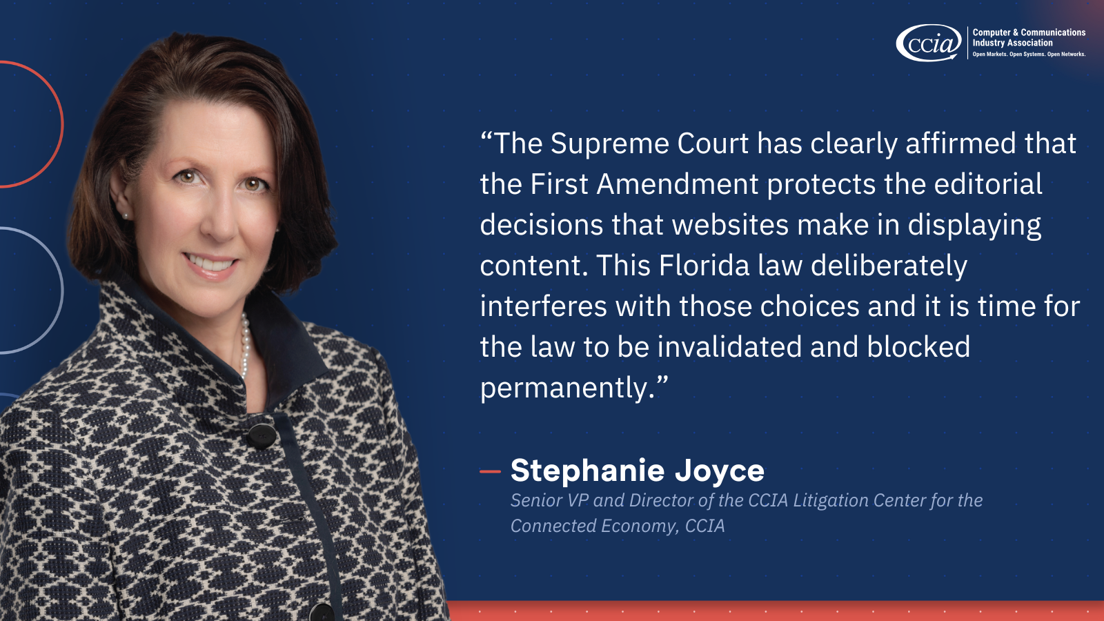 Washington – The Computer & Communications Industry Association, along with its co-plaintiff NetChoice, has filed a partial motion for summary judgment in its legal challenge to Florida SB7072, the “internet must-carry” law. The motion asks for judgment in Plaintiffs’ favor and an order permanently blocking it from becoming effective.