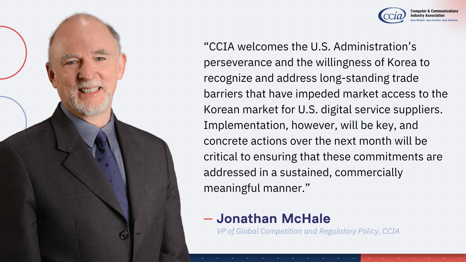 “CCIA welcomes the U.S. Administration’s perseverance and the willingness of Korea to recognize and address long-standing trade barriers that have impeded market access to the Korean market for U.S. digital service suppliers. Implementation, however, will be key, and concrete actions over the next month will be critical to ensuring that these commitments are addressed in a sustained, commercially meaningful manner.”