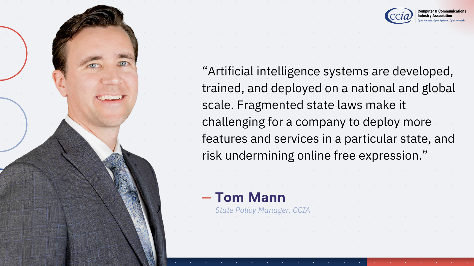 “Artificial intelligence systems are developed, trained, and deployed on a national and global scale. Fragmented state laws make it challenging for a company to deploy more features and services in a particular state, and risk undermining online free expression.