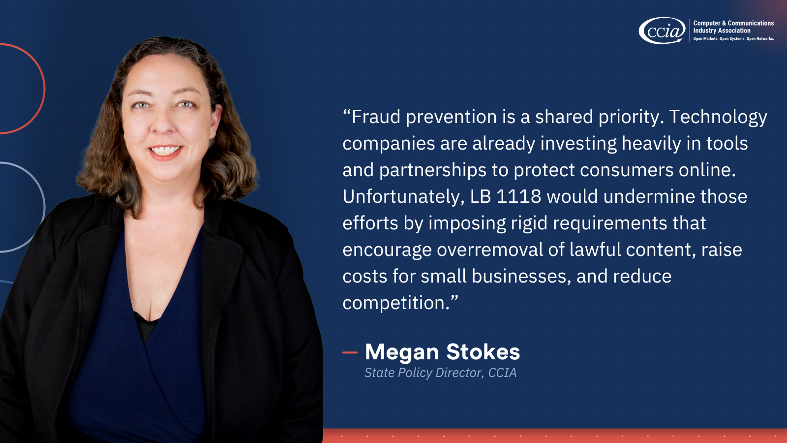Washington – The Computer & Communications Industry Association is testifying today before the Nebraska Legislature’s Banking, Commerce and Insurance Committee in opposition to LB 1118, warning that the proposal would undermine existing efforts to combat online fraud while imposing unworkable mandates that could harm consumers, small businesses, and competition.