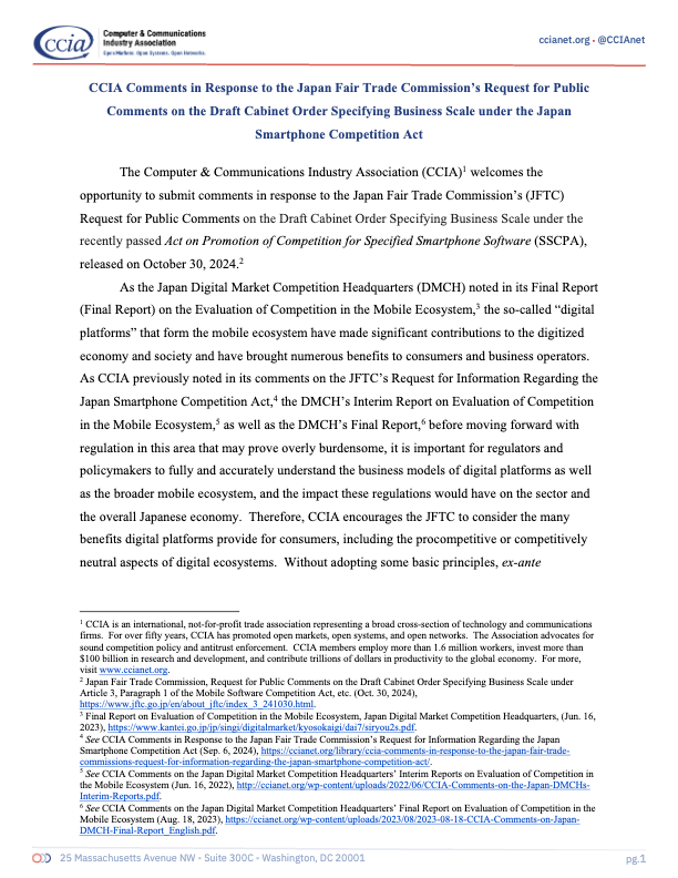 CCIA Comments in Response to the Japan Fair Trade Commission’s Request for Public Comments on the Draft Cabinet Order Specifying Business Scale under the Japan Smartphone Competition Act