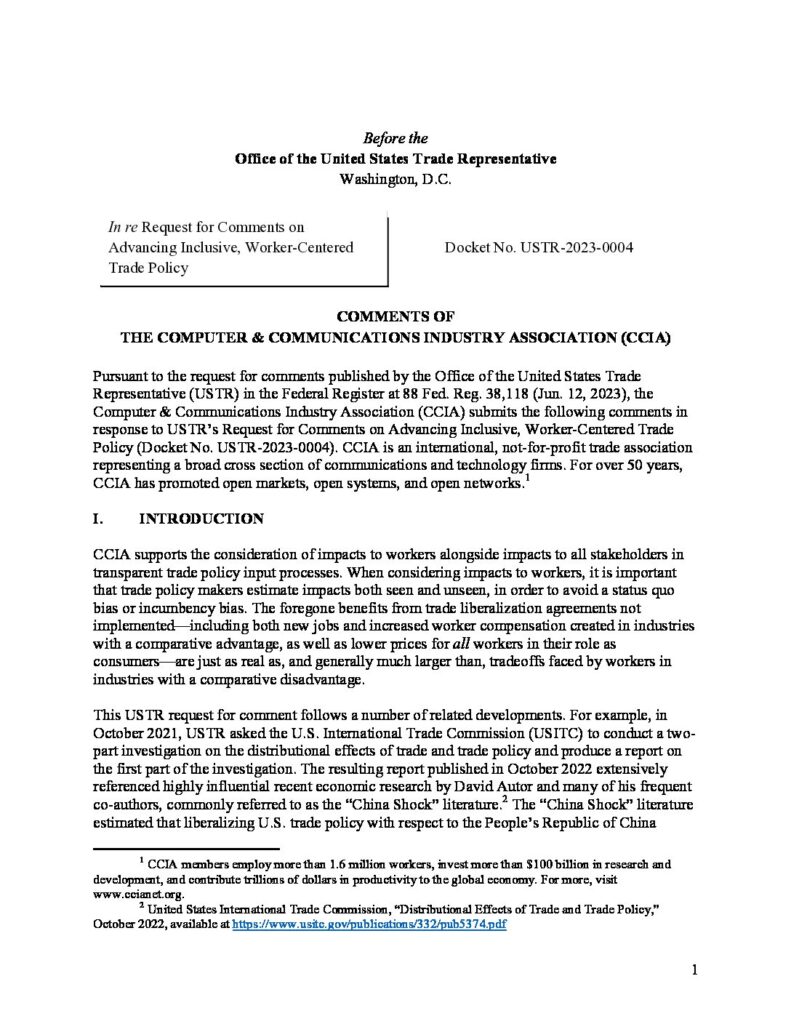 CCIA Comments to USTR on Worker-Centered Trade