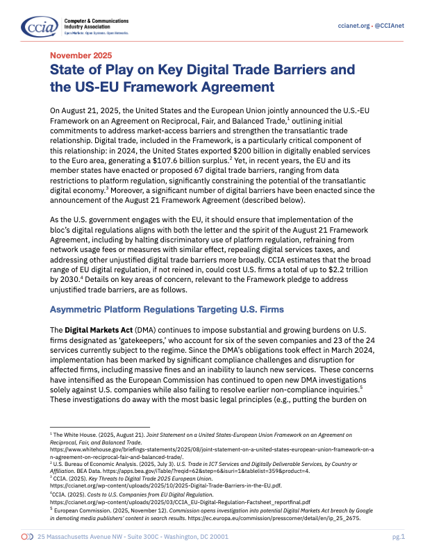 State of Play on Key Digital Trade Barriers and the US-EU Framework Agreement