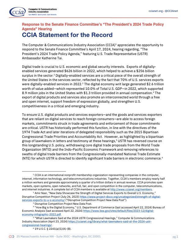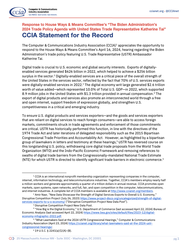CCIA Statement for the Record: Committee on Ways & Means, Subcommittee on Trade Hearing on Maintaining American Innovation and Technology Leadership