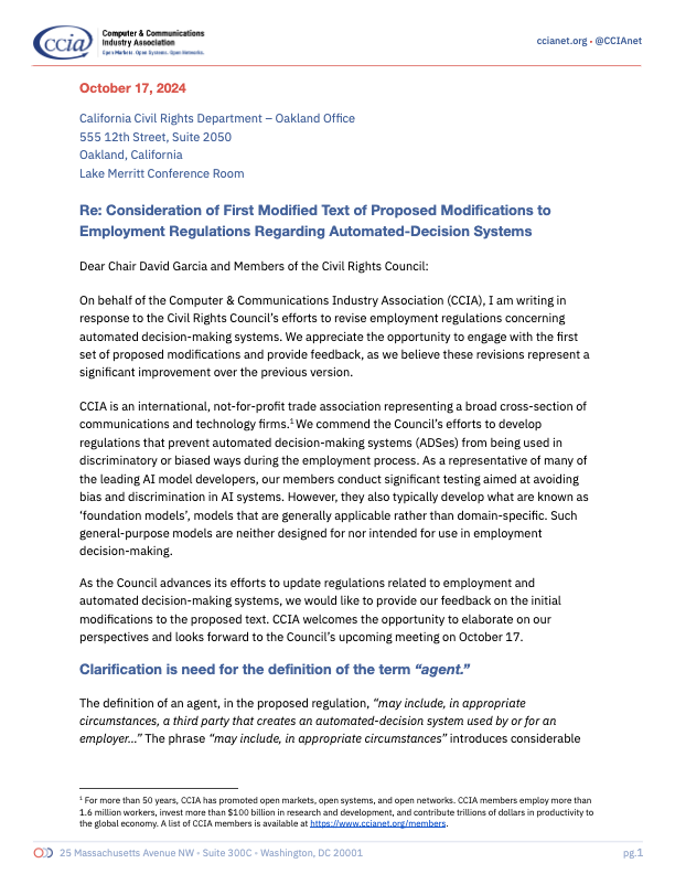 CCIA Letter to CA Civil Rights Council Regarding the Consideration of the First Modified Text of Proposed Modifications to Employment Regulations Regarding Automated-Decision Systems
