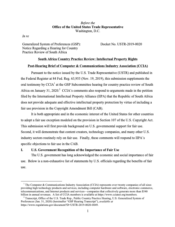 CCIA Post-Hearing Brief to USTR on South Africa Copyright Review
