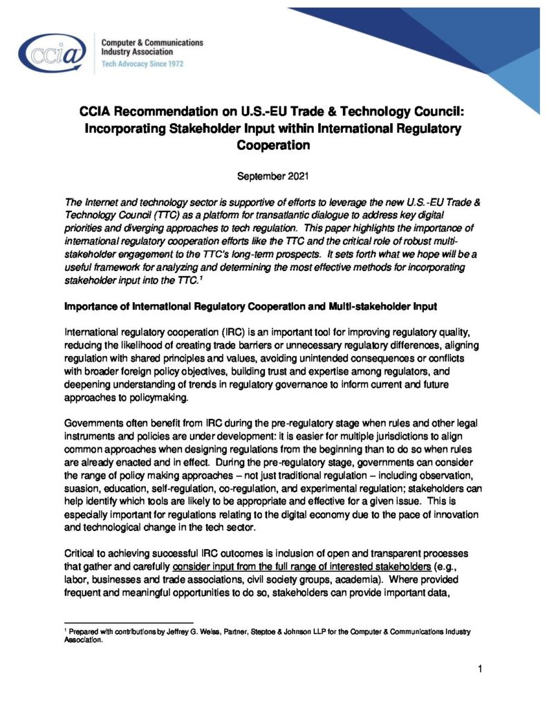 CCIA TTC Recommendations – Incorporating Stakeholder Input within International Regulatory Cooperation