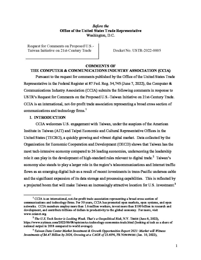 CCIA Comments to USTR on U.S.-Taiwan Trade Initiative
