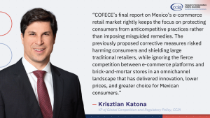 Washington – Earlier today, the Mexican competition authority (COFECE) released its final report on competition in the e-commerce retail market. After previously identifying possible barriers to com...